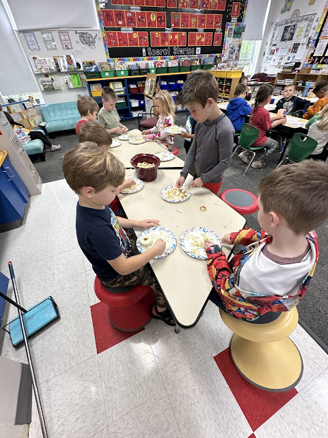 Good afternoon! We've had a very busy week! We had Picture Day...it went well! We learned about the season of the apple tree and about Johnny Appleseed! We went on a field trip to Conant's Apple Orchard. Thank you chaperones!! We made our own applesauce back in our classroom. We rewrote a book called Rain Makes Applesauce. We used a book called Six Big Apples for shared reading. We also rewrote a book called A My Name Is Alice. The kids had a choice to bring these three new books home or to keep them in their book boxes for awhile to read here. If you do not see them this weekend, you will see them soon.